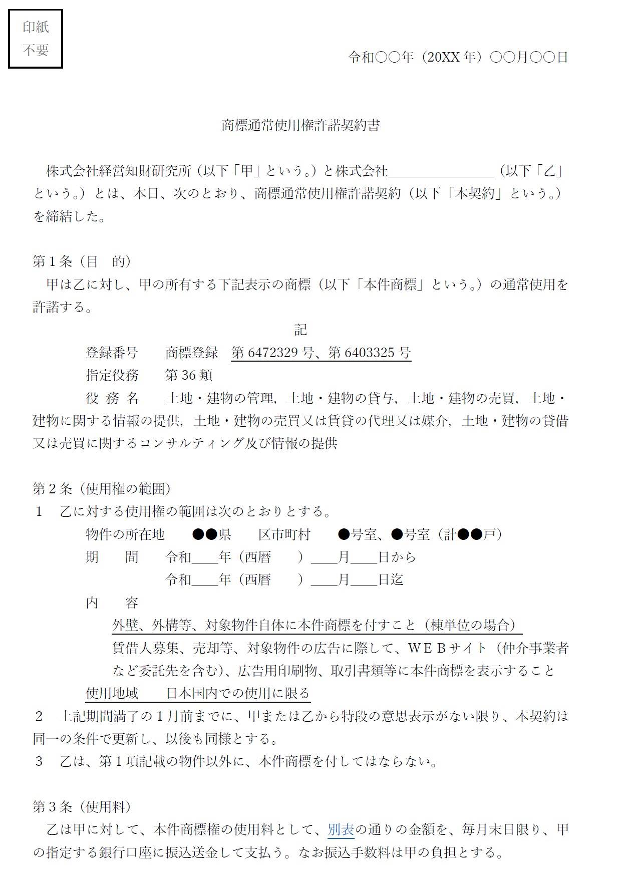 標準的な使用許諾契約(案)は下記の通りです。具体的な使用方法に応じてご相談に応じます。